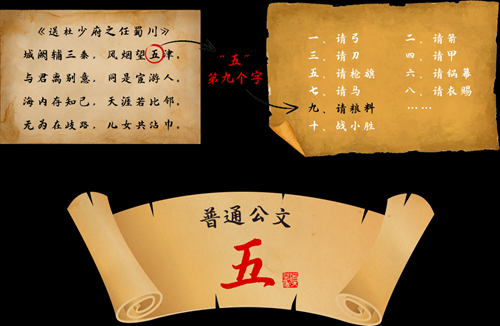 假設(shè)雙方以唐代王勃的《送杜少府之任蜀川》作為解碼密鑰,如果軍隊(duì)需要補(bǔ)充糧食,前方將領(lǐng)就從密碼本中查出“請(qǐng)糧料”的編碼(也就是第九),《送杜少府之任蜀川》中的第九字是“五”,將領(lǐng)就把“五”字寫到一件普通公文中,并在這個(gè)字上加蓋印章。