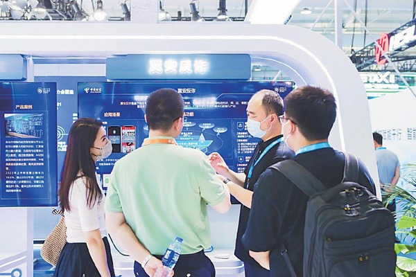 ②中國電信自研安防產(chǎn)品集中亮相2023中國國際社會(huì)公共安全產(chǎn)品博覽會(huì)。圖為翼安反詐展項(xiàng)。