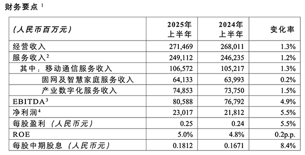 2025年上半年,公司經(jīng)營收入為人民幣2,715億元,同比增長1.3%,其中服務(wù)收入為人民幣2,491億元,同比增長1.2%。EBITDA為人民幣806億元,同比增長4.9%。凈利潤為人民幣230億元,同比增長5.5%,每股基本凈利潤為人民幣0.25元。資本開支為人民幣342億元。自由現(xiàn)金流為人民幣131億元,同比增長13.9%。