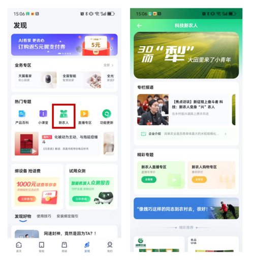 深耕數(shù)字應用,助力鄉(xiāng)村振興。為了讓田間地頭的好產(chǎn)品走進市場,帶動村集體和村民持續(xù)增收,更好地宣傳新農(nóng)人與新農(nóng)業(yè),小翼管家定期上線新鮮果蔬、農(nóng)副產(chǎn)品等優(yōu)惠活動,為用戶提供可以一站式購買的綠色健康的農(nóng)產(chǎn)品。天翼數(shù)字生活公司通過全新直播帶貨形式和“新農(nóng)人”專欄,聚力講好鄉(xiāng)間故事,探索了助農(nóng)惠農(nóng)的新路徑。