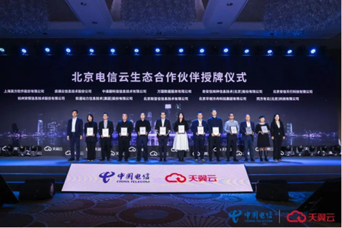活動最后,北京公司為北京華創(chuàng)方舟、同方有云(北京)、上海英方軟件等11家新招募云生態(tài)合作伙伴舉行授牌儀式,北京公司副總經理孫健、天翼云科技有限公司助理總經理宮梅霞共同為合作伙伴代表授牌。