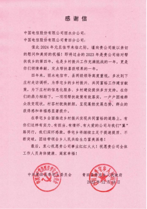 自幫扶工作開(kāi)展以來(lái),浙江麗水分公司立足自身優(yōu)勢(shì),開(kāi)展了一系列幫扶工作,為下莊村提供了信息化服務(wù)、項(xiàng)目建設(shè)、產(chǎn)業(yè)振興等多方面的支持,實(shí)現(xiàn)了精準(zhǔn)幫扶。四年來(lái),捐贈(zèng)幫扶資金22.5萬(wàn)元,農(nóng)產(chǎn)品消費(fèi)幫扶33.12萬(wàn)元。季宅鄉(xiāng)委、鄉(xiāng)政府對(duì)麗水電信的傾情幫扶表達(dá)了由衷的謝意。