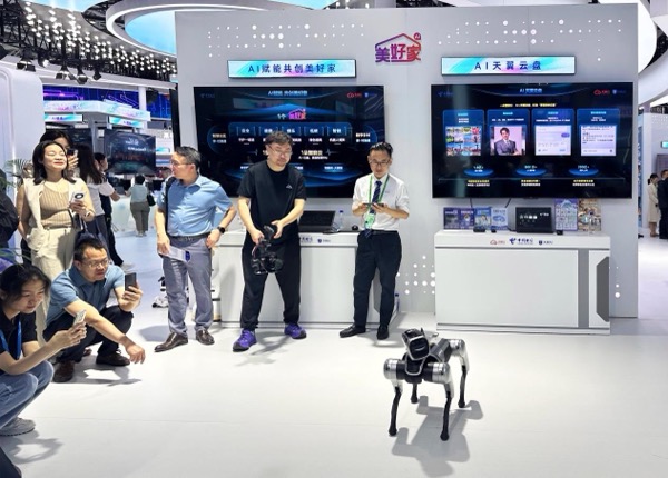 在展臺現(xiàn)場的體驗區(qū),天翼數(shù)字生活公司的美好家機器人吸引了眾多觀眾駐足互動。專為孩子們打造的兒童陪伴桌面機器人,正聲情并茂地講著故事,據(jù)工作人員介紹,該智能機器人將情感識別與學(xué)習(xí)融合,支持主動提問、智能引導(dǎo),還能進行情感識別,推送心情日報與學(xué)習(xí)狀態(tài),給予兒童高質(zhì)量的陪伴。此外,運動人士的智能健身搭子---天翼陪跑機器狗在展區(qū)內(nèi)蹦跳,十分吸睛,機器狗13個關(guān)節(jié)十分靈活,能陪練、能嘮嗑,跳舞、握手樣樣都行,還能充當(dāng)搬運工幫忙取快遞,具象地展現(xiàn)了智能機器人賦能生活的美好畫面。