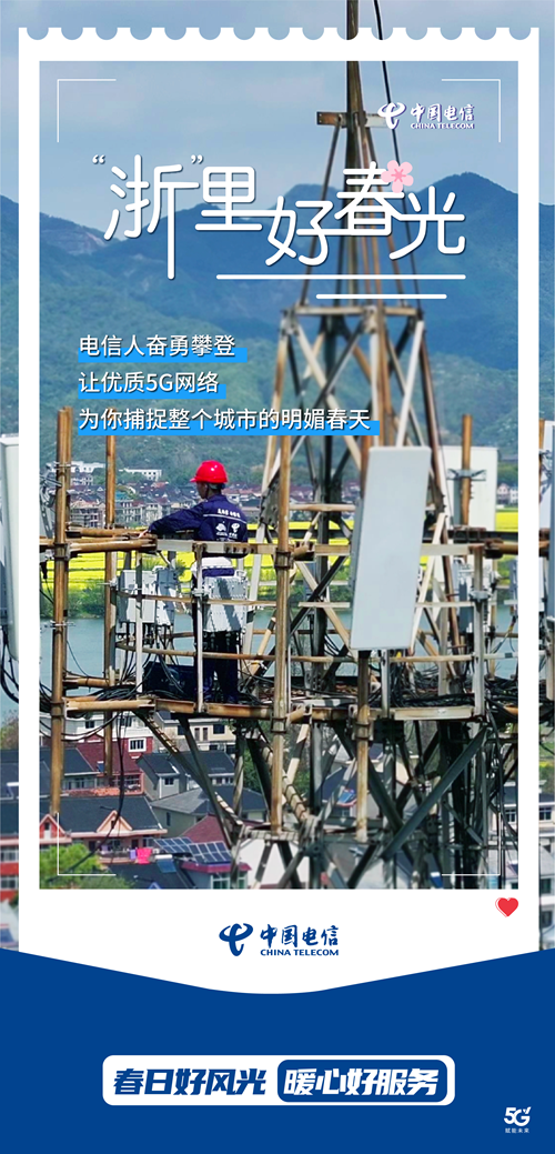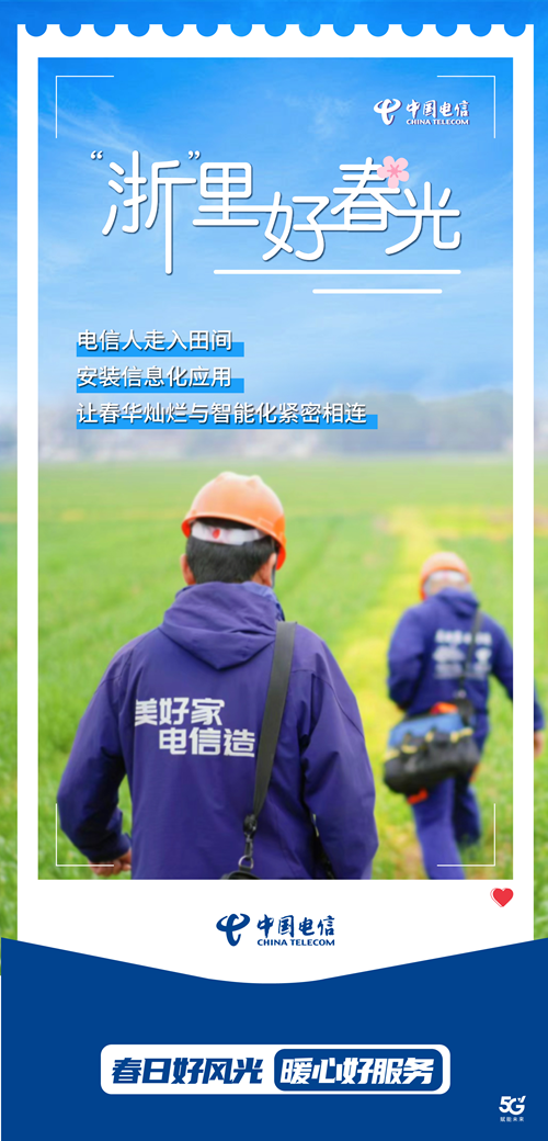 楊柳青青江水平,浙江春色滿(mǎn)城隅。在這春意盎然的時(shí)節(jié),中國(guó)電信浙江分公司深入鄉(xiāng)村,安裝和維護(hù)智能應(yīng)用,為廣大用戶(hù)“裝”點(diǎn)美好信息生活。愿我們的5G網(wǎng)絡(luò),如春風(fēng)拂面,讓您隨時(shí)分享生活的點(diǎn)滴,暢享春日好風(fēng)光。
