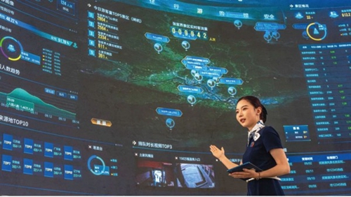 中國電信湖南公司依托5G、天翼云、人工智能等技術(shù)優(yōu)勢,打造了“張家界智慧旅游平臺”。圖為2023年5月,中國電信湖南公司工作人員介紹“張家界智慧旅游平臺”。