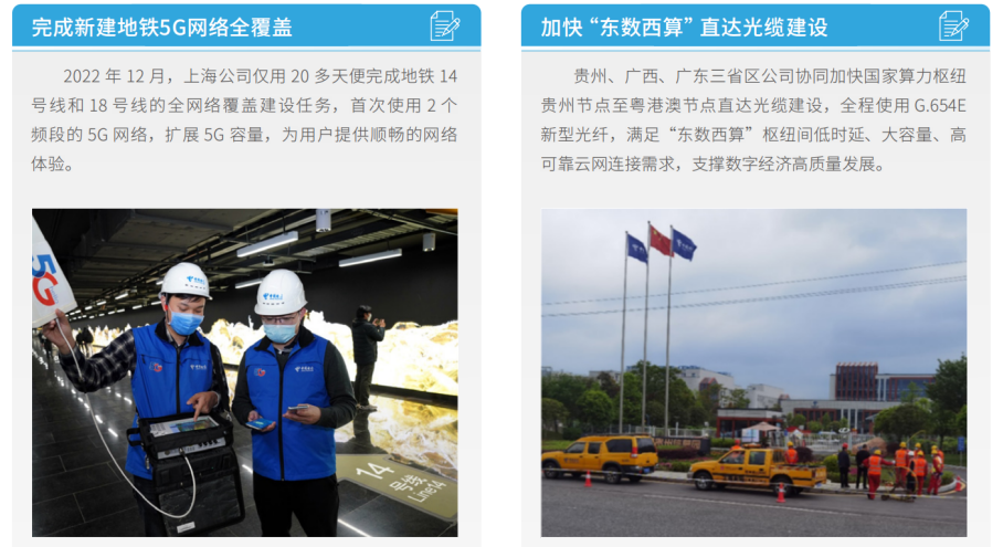 中國電信加快雙千兆網(wǎng)絡(luò)建設(shè)。移動網(wǎng)方面,全面建成了全球首張規(guī)模最大、網(wǎng)速最快的5G SA共建共享精品網(wǎng)絡(luò), 開通5G共享基站100萬站,實現(xiàn)高中低多頻協(xié)同等技術(shù)突破,基本實現(xiàn)發(fā)達鄉(xiāng)鎮(zhèn)以上區(qū)域的室外連續(xù)覆蓋、高流量行政 村熱點覆蓋、中高業(yè)務(wù)場景的室內(nèi)深度覆蓋,為全球5G SA部署提供了應(yīng)用示范。寬帶網(wǎng)方面,建成全球最大的千兆光 網(wǎng),新建10G PON端口297萬個,千兆光網(wǎng)覆蓋超過2.9億家庭住宅,有效支撐千城千兆業(yè)務(wù)發(fā)展。