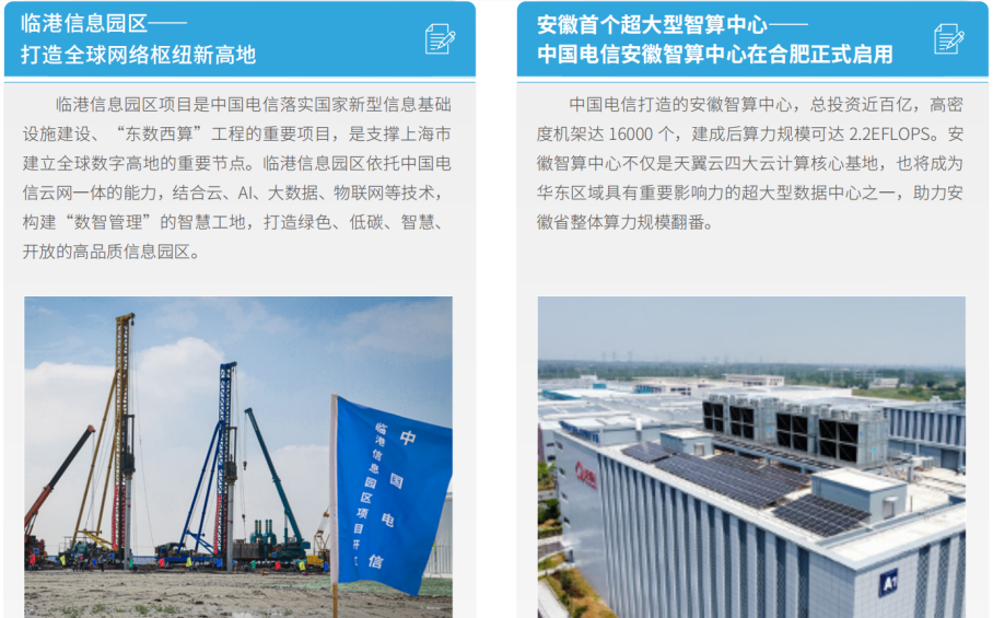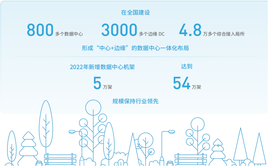 中國電信積極布局算力基礎(chǔ)設(shè)施,在京津冀、長三角、粵港澳、成渝等區(qū)域中心節(jié)點,打造支持大規(guī)模、多可用 區(qū)的新一代云底座天翼云4.0,為用戶提供高可用的云服務(wù)。在241個城市建設(shè)“一城一池”節(jié)點,為客戶提供更好的數(shù) 據(jù)本地化、超低時延分布式云服務(wù)。強化行業(yè)專屬云與客戶私有云能力建設(shè),為千行百業(yè)數(shù)字化轉(zhuǎn)型打造安全可信的 云底座。在全國建設(shè)800多個數(shù)據(jù)中心、3000多個邊緣DC和4.8萬多個綜合接入局所,形成“中心+邊緣”的數(shù)據(jù)中心一 體化布局,2022年新增數(shù)據(jù)中心機架5萬架,總規(guī)模達54萬架,保持行業(yè)領(lǐng)先。