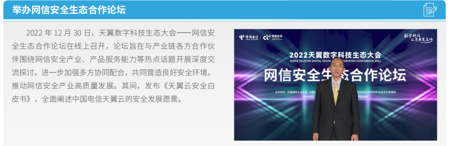中國電信堅持以人民為中心的發(fā)展思想,加大優(yōu)質(zhì)高效的數(shù)字化產(chǎn)品和服務(wù)供給,著力滿足廣大客戶對美好數(shù)字生活的新需求,不斷提高人民群眾的獲得感、幸福感、安全感。堅持全面融云、融AI、融安全、融平臺,提供云網(wǎng)邊端安全深度融合定制,著力推動產(chǎn)業(yè)數(shù)字化加速發(fā)展。