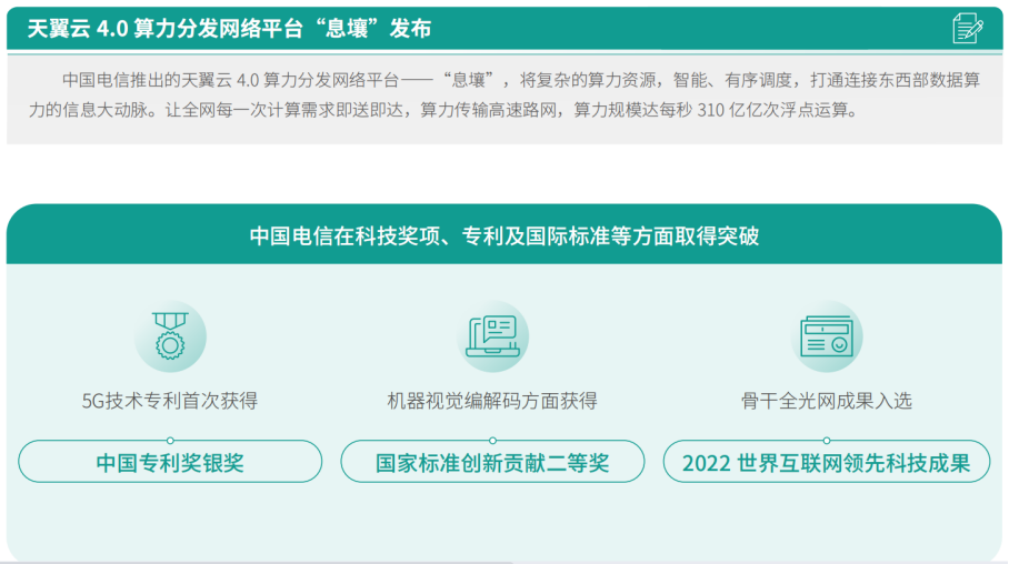 中國電信強(qiáng)化科技創(chuàng)新對(duì)企業(yè)的戰(zhàn)略支撐作用,業(yè)內(nèi)影響力不斷提升。作為首批策源地單位,加快云計(jì)算原創(chuàng)技術(shù)策源地建設(shè),天翼云突破云操作系統(tǒng)、彈性計(jì)算、云存儲(chǔ)、分布式數(shù)據(jù)庫、CDN等關(guān)鍵核心技術(shù),TeleCloud OS4.0打破開源限制,天翼云4.0算力分發(fā)網(wǎng)絡(luò)平臺(tái)“息壤”入選“2022年度央企十大超級(jí)工程”。承建和開通全球規(guī)模最大的量子城域網(wǎng)“合肥量子城域網(wǎng)”。形成自研清單成果84個(gè),員工小微成果1500余個(gè),智能視頻云、天翼看家、CDN等收入達(dá)到十億元級(jí),天翼云桌面、云堤等7項(xiàng)收入達(dá)到五億元級(jí),網(wǎng)站安全專家、天翼安全大腦等6項(xiàng)收入達(dá)到億元級(jí)。面向共建共享網(wǎng)絡(luò)的智慧運(yùn)營系統(tǒng)等7項(xiàng)成果成功入選國務(wù)院國資委《中央企業(yè)科技創(chuàng)新成果推薦目錄(2022版)》。