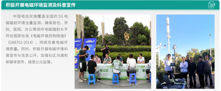 中國電信針對(duì)政府和公眾關(guān)心的通信工程建設(shè)中耕地保護(hù)、設(shè)備污染、施工影響和電磁輻射等問題,制定《中國電信通信基站電磁環(huán)境保護(hù)管理辦法(試行稿)》,建立健全電磁輻射管理體系與風(fēng)險(xiǎn)防范機(jī)制,積極實(shí)施環(huán)境測(cè)評(píng)等各項(xiàng)環(huán)保措施,夯實(shí)環(huán)境保護(hù)基礎(chǔ),確保達(dá)到政府監(jiān)管要求,并積極與公眾做好溝通。