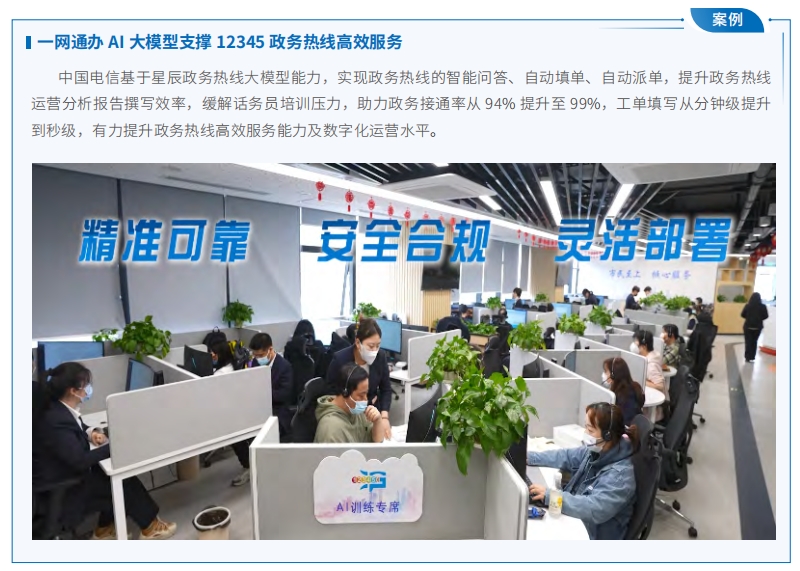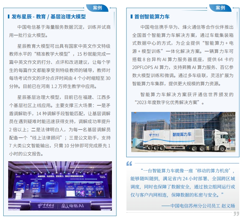 中國電信結(jié)合自身在算力、數(shù)據(jù)、行業(yè)應(yīng)用等方面的優(yōu)勢,依托 AI 能力自主研發(fā)星辰語義大模型,與合作伙伴共同開拓行業(yè)重點場景和細分場景大模型。構(gòu)建“1+N+M”(1 是通用基礎(chǔ)大模型,N 是行業(yè)大模型數(shù)量,M 是自用大模型數(shù)量)的星辰大模型系列產(chǎn)品體系,面向政務(wù)、教育、交通等垂直領(lǐng)域發(fā)布 12 個行業(yè)大模型。推出“星辰 MaaS(Model as a Service,模型即服務(wù))平臺”,為客戶提供智算算力、通用大模型、行業(yè)大模型、能力工具、數(shù)據(jù)集于一體的大模型服務(wù)。