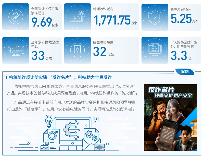 中國電信扎實開展通信詐騙、騷擾電話和垃圾短信的綜合治理。通過持續(xù)提升技術(shù)防范能力、加強重點業(yè)務(wù)監(jiān)測處置等措施,全年累計關(guān)停攔截涉詐短信 9.69 億條,封堵涉詐域名 1,771.75 萬個,關(guān)停涉案號碼 5.25 萬個,開展線上線下一體化防詐宣傳,累計觸達 2,700 萬人次。通過開展合規(guī)性管控、持續(xù)提升技術(shù)防范能力、為用戶提供按個人意愿攔截騷擾電話服務(wù)等措施,全年累計攔截騷擾電話 33 億次,攔截垃圾短信 32 億條,“天翼防騷擾”業(yè)務(wù),用戶規(guī)模達 3.3億。中國電信騷擾電話、垃圾短信被舉報量持續(xù)保持行業(yè)低位。