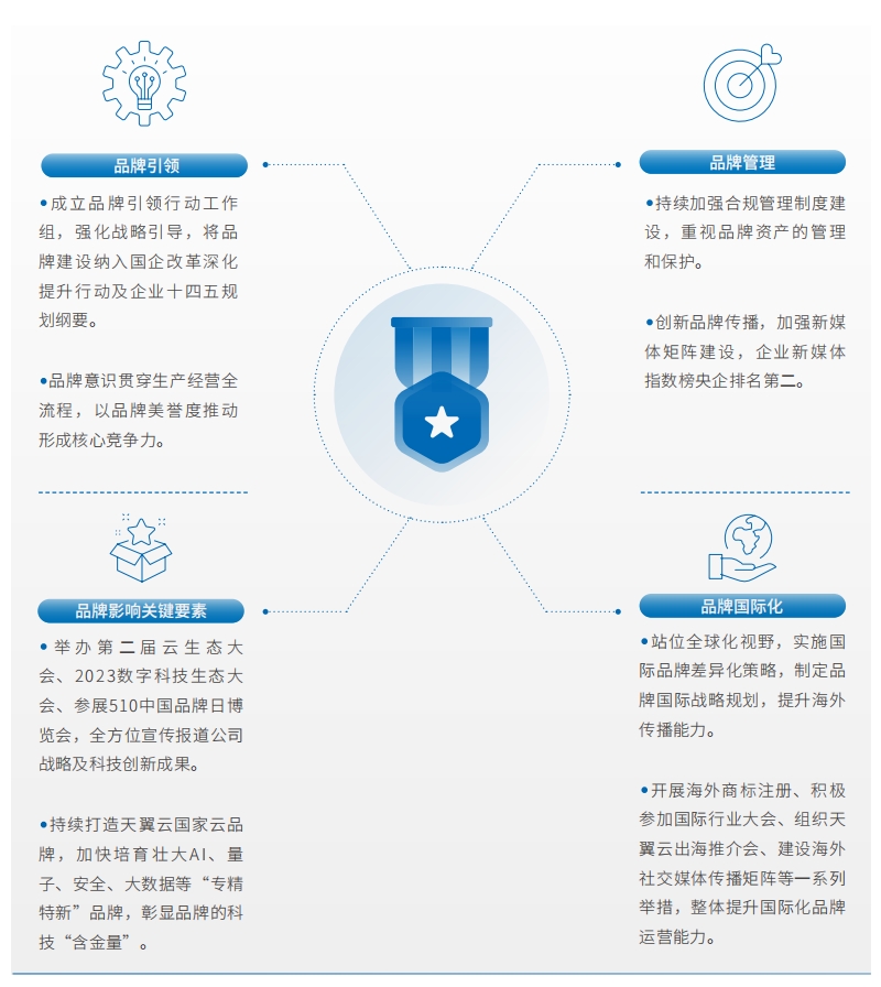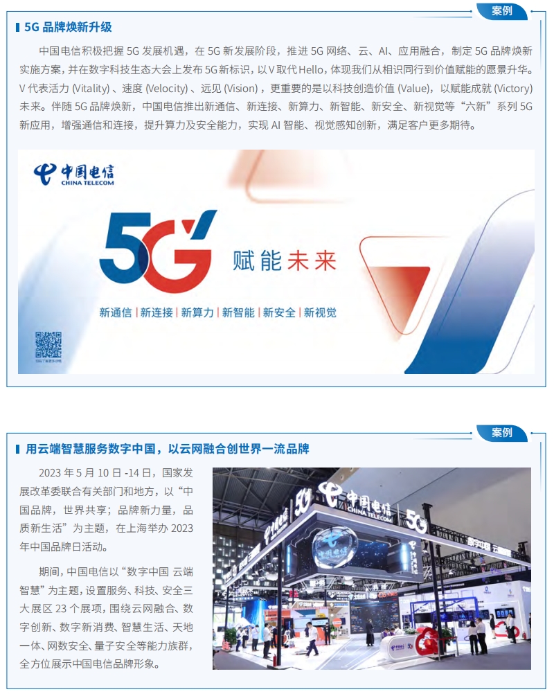2023 年,中國電信以品牌引領(lǐng)行動為抓手,打造管理科學(xué)、價值領(lǐng)先、行業(yè)領(lǐng)軍的卓著品牌,以品質(zhì)鑄造品牌,以品牌推動發(fā)展。持續(xù)強化企業(yè)品牌運營能力,不斷形成品牌競爭新優(yōu)勢,強化服務(wù)型、科技型、安全型的企業(yè)品牌內(nèi)涵。持續(xù)打造完善的品牌建設(shè)體系、成熟的品牌推廣能力和先進的品牌國際化運營模式,印發(fā)《中國電信對標(biāo)世界一流企業(yè)品牌引領(lǐng)行動實施方案》,推進落實品牌引領(lǐng)、品牌管理、品牌影響關(guān)鍵要素和品牌國際化四大舉措。