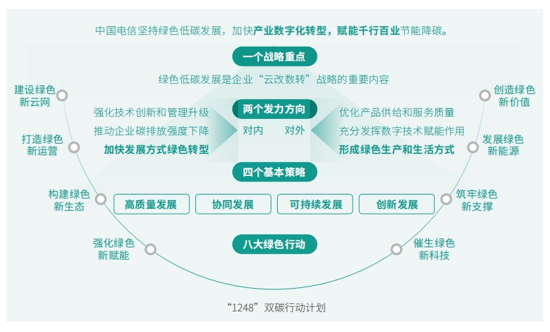 中國電信貫徹落實國家“雙碳”戰(zhàn)略目標(biāo),積極落實《關(guān)于完整準(zhǔn)確全面貫徹新發(fā)展理念做好碳達(dá)峰碳中和工作的意見》《2030 年前碳達(dá)峰行動方案》《關(guān)于推動能耗雙控逐步轉(zhuǎn)向碳排放雙控的意見》以及國家相關(guān)部委“1+N”系列政策文件精神,以“1248”雙碳行動計劃為指引,將綠色低碳貫穿企業(yè)生產(chǎn)經(jīng)營全過程。