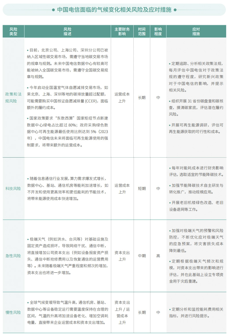中國電信積極應(yīng)對氣候變化,將氣候相關(guān)風(fēng)險管理納入風(fēng)險管理,實現(xiàn)風(fēng)險梳理、風(fēng)險評估、關(guān)鍵風(fēng)險分析、風(fēng)險應(yīng)對和風(fēng)險監(jiān)測跟蹤的閉環(huán)管理。針對不同的風(fēng)險類別,評估其對財務(wù)和運營發(fā)展的影響,并提出相應(yīng)措施。