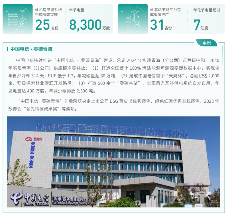 持續(xù)推進 AI 節(jié)能,自主研發(fā)智慧 AI 節(jié)能系統(tǒng),實現(xiàn)對 4/5G 基站、通信機房和數(shù)據(jù)中心的精準(zhǔn)節(jié)能。AI 機房節(jié)能系統(tǒng)在 25 省份完成部署實施,年節(jié)電量 8,300 萬度;AI 基站節(jié)能平臺完成 31 省份部署推廣,年化節(jié)電量超過 7 億度。通過智慧 AI 節(jié)能系統(tǒng)部署,年化減少溫室氣體排放超過 44 萬噸。