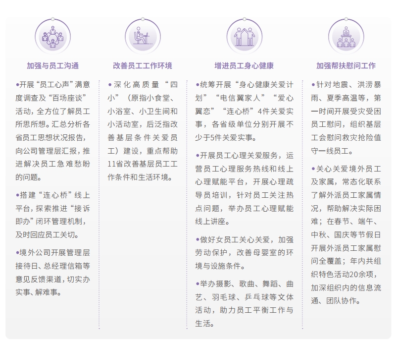 中國電信持續(xù)加強(qiáng)與員工溝通,了解員工訴求,加大對員工關(guān)懷,積極解決急難愁盼問題,提升廣大員工獲得感、幸福感、安全感,營造和諧向上的良好氛圍。