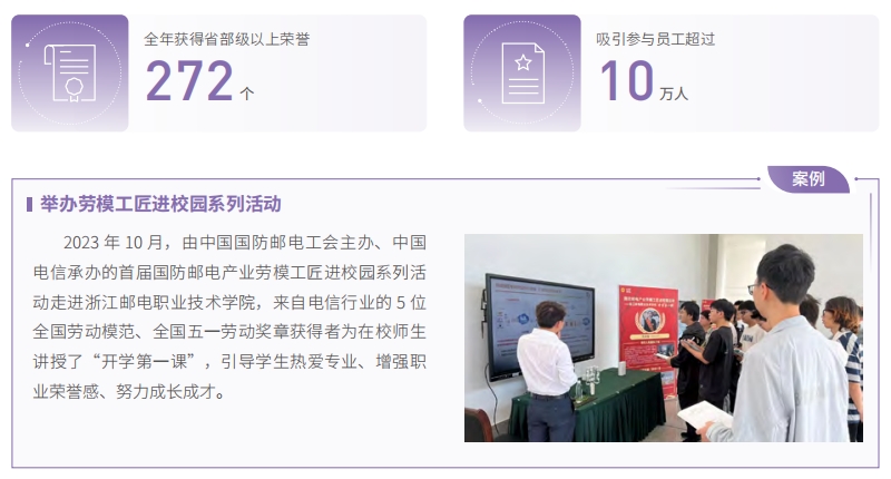 大力弘揚(yáng)勞模精神、勞動精神、工匠精神,全年獲得省部級以上榮譽(yù) 272 個,優(yōu)化員工榮譽(yù)體系向科技創(chuàng)新、戰(zhàn)新業(yè)務(wù)、產(chǎn)數(shù)技能傾斜,組織百余場“勞模講堂”賦能基層一線,吸引參與員工超過 10 萬人。