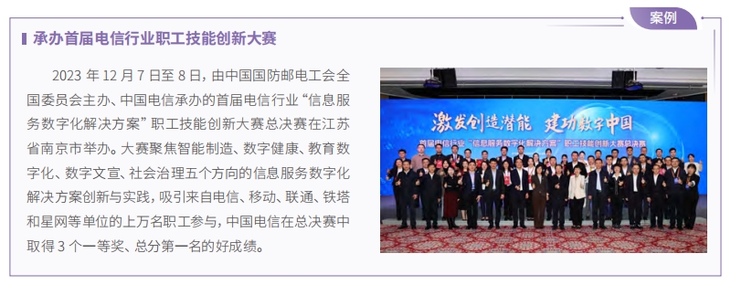 開展勞動和技能競賽。以“云改數(shù)轉(zhuǎn)我爭先”為主題,開展面向全員的勞動、技能競賽,覆蓋多個專業(yè)領(lǐng)域和技能賽道,超過 20 萬人次參加競賽,以賽促訓(xùn)提升員工技能。