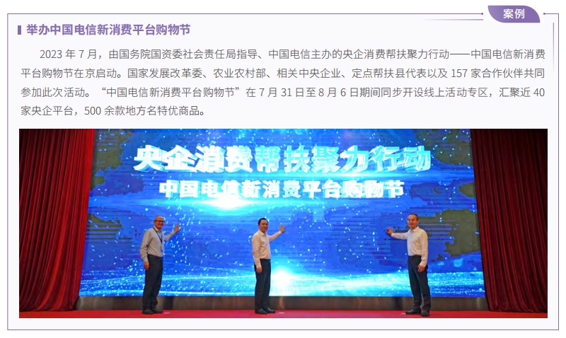 中國電信始終將消費(fèi)幫扶作為促進(jìn)脫貧地區(qū)特色產(chǎn)業(yè)提質(zhì)增效和持續(xù)發(fā)展的重要途徑,積極參與國務(wù)院國資委“央企消費(fèi)幫扶聚力行動”“央企消費(fèi)幫扶興農(nóng)周”,直接購買農(nóng)副產(chǎn)品 1.85 億元,幫助銷售農(nóng)產(chǎn)品 2.96 億元。