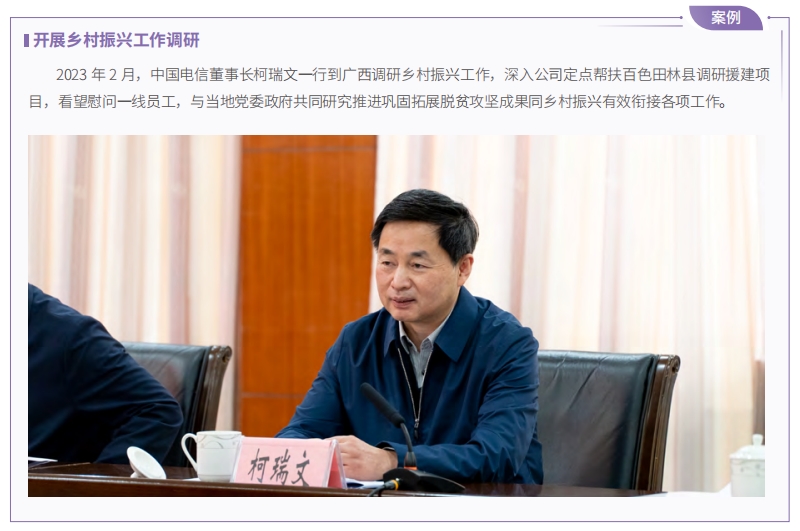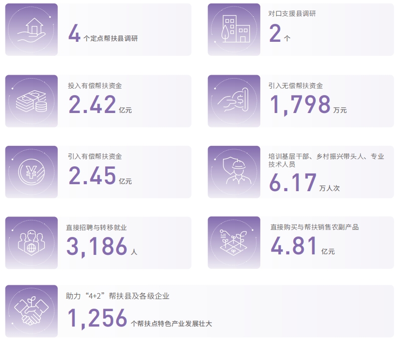 中國電信開展 4 個定點(diǎn)幫扶縣和 2 個對口支援縣(以下稱“4+2”幫扶縣)調(diào)研,投入有償幫扶資金 2.42 億元;引入無償幫扶資金 1,798 萬元;引入有償幫扶資金 2.45 億元;培訓(xùn)基層干部、鄉(xiāng)村振興帶頭人、專業(yè)技術(shù)人員 6.17萬人次;直接招聘與轉(zhuǎn)移就業(yè) 3,186 人;直接購買與幫扶銷售農(nóng)副產(chǎn)品 4.81 億元,助力“4+2”幫扶縣及各級企業(yè) 1,256個幫扶點(diǎn)特色產(chǎn)業(yè)發(fā)展壯大。