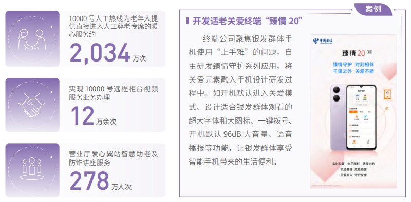 中國電信積極弘揚(yáng)孝親敬老傳統(tǒng)美德,助力銀發(fā)一族跨越“數(shù)字鴻溝”。聚焦老年人日常生活涉及的高頻事項(xiàng),集中力量為老年人提供更便捷、更貼心、更優(yōu)質(zhì)的信息通信服務(wù)和專屬服務(wù)。10000 號人工熱線為老年人提供約 2,034萬次直接進(jìn)入人工尊老專席的暖心服務(wù),實(shí)現(xiàn) 10000 號遠(yuǎn)程柜臺視頻服務(wù)業(yè)務(wù)辦理 12 萬余次。營業(yè)廳愛心翼站智慧助老及防詐講座服務(wù) 278 萬人次。升級中國電信 APP,實(shí)現(xiàn) AI 數(shù)字人的服務(wù)助老能力,持續(xù)完善關(guān)愛版用戶體驗(yàn),實(shí)現(xiàn)遠(yuǎn)程助老、家庭圈功能。推動適老化數(shù)字技術(shù)迭代升級,AI 守護(hù)、翼家健康等老年人產(chǎn)品使用感知大幅提升。