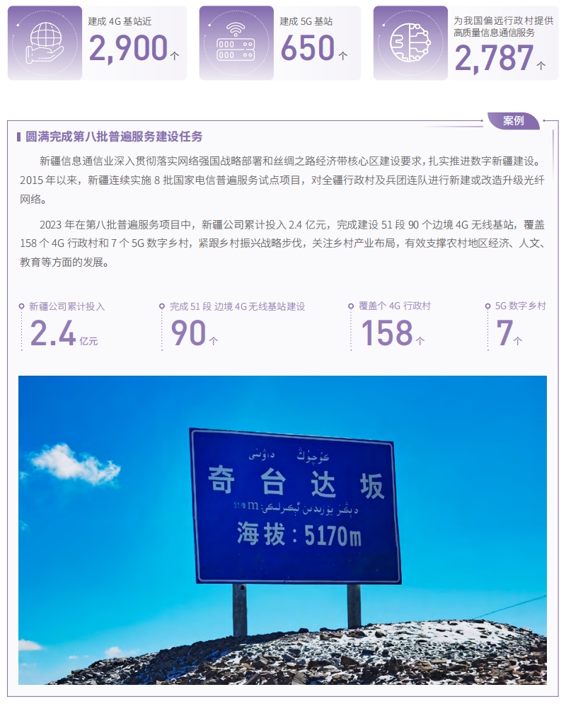 中國電信連續(xù) 8 年承擔(dān)電信普遍服務(wù)任務(wù),從鋪光纜到建基站,不斷提高邊疆偏遠(yuǎn)地區(qū)網(wǎng)絡(luò)覆蓋,彌合區(qū)域間“數(shù)字鴻溝”。2023 年,中國電信繼續(xù)深入實(shí)施第八批普遍服務(wù),建成近 2,900 個 4G 基站,650 個 5G 基站,為我國 2,787個偏遠(yuǎn)行政村提供高質(zhì)量信息通信服務(wù)。