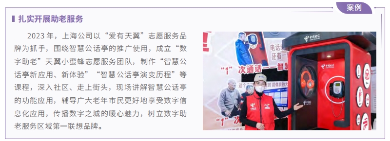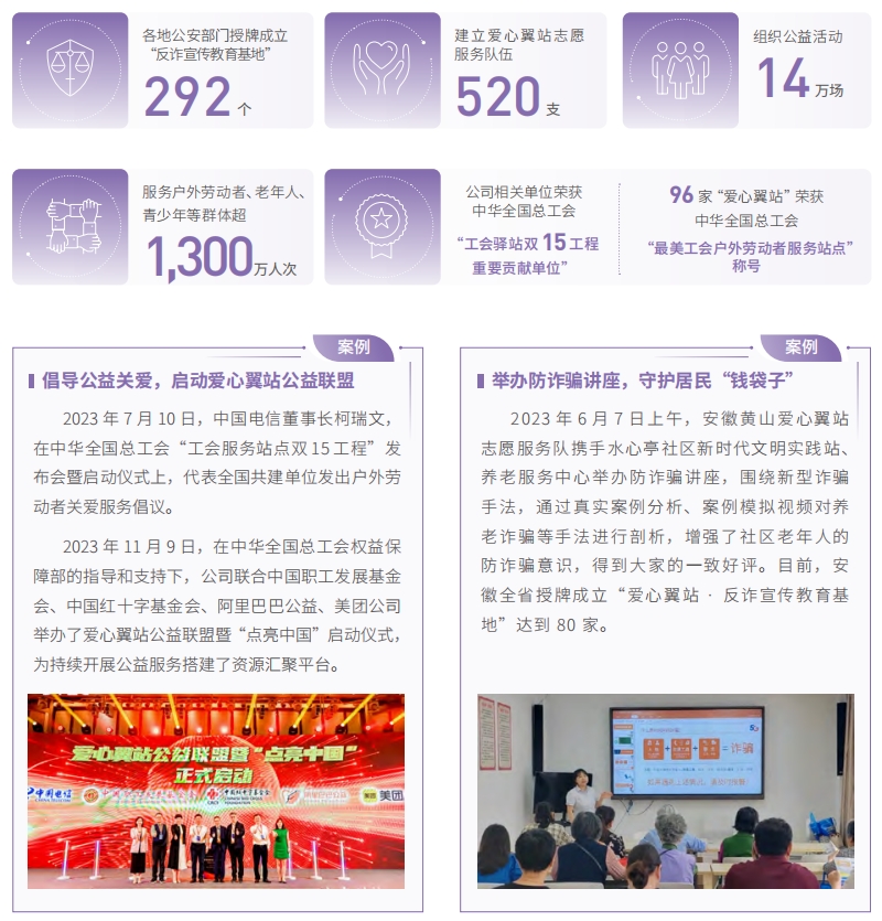中國電信不斷深化“愛心翼站”公益服務(wù),發(fā)揮小切口大平臺作用,以有溫度的服務(wù)關(guān)懷社會特殊群體。建設(shè)擴(kuò)充服務(wù)站點(diǎn),融入屬地社區(qū)開展戶外勞動者關(guān)愛、智慧助老、青少年信息科普等全年齡段公益服務(wù),打造“戶外勞動者的港灣、跨越數(shù)字鴻溝的紐帶、科普信息技術(shù)的講臺和防范網(wǎng)絡(luò)詐騙的陣地”。開展愛心翼站全國點(diǎn)亮,實(shí)現(xiàn)近十萬家城鄉(xiāng)營業(yè)廳普遍加載“飲水休息、手機(jī)充電、廁所指引、手機(jī)輔導(dǎo)、防騙提醒、安防輔導(dǎo)”六項(xiàng)公益服務(wù),各地公安部門授牌成立“反詐宣傳教育基地”292 個,建立愛心翼站志愿服務(wù)隊伍 520 支,組織“清爽夏日愛騎月”“高考加油站”“暖冬計劃”等公益活動 14 萬場,服務(wù)戶外勞動者、老年人、青少年等群體超 1,300 萬人次。公司相關(guān)單位榮獲中華全國總工會“工會驛站雙 15 工程重要貢獻(xiàn)單位”,96 家“愛心翼站”榮獲中華全國總工會“最美工會戶外勞動者服務(wù)站點(diǎn)”稱號,獲評數(shù)量在全國共建單位中排名領(lǐng)先,廣西河池金城江街道新建社區(qū)(愛心翼站)榮獲中國科協(xié)“最美科技志愿服務(wù)點(diǎn)”。