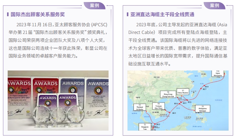 中國電信持續(xù)提升跨國通信服務(wù)能力,服務(wù)中國高水平對外開放。國際化經(jīng)營覆蓋全球主要市場,在全球42 個國家和地區(qū)設(shè)立 50 家分支機(jī)構(gòu),與 400 多家境外電信運(yùn)營商開展了跨境數(shù)據(jù)和語音合作,為跨國企業(yè)客戶提供個性化、高性價比的綜合通信解決方案,積極助力中資企業(yè)走出去,外資企業(yè)進(jìn)入中國市場。