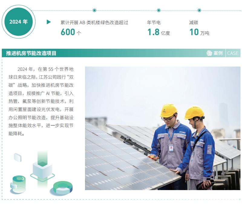 中國電信以“1248”綠色發(fā)展模式為指引,推進綠色云網(wǎng)、綠色辦公、循環(huán)利用、綠色用能、綠色科創(chuàng)和綠色管理等領(lǐng)域工作,不斷挖掘自身降碳潛能。