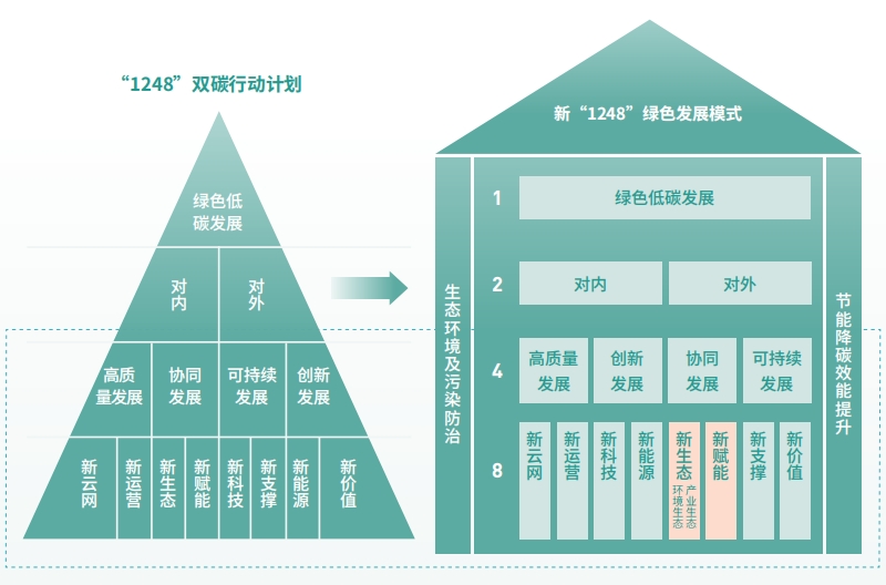 中國電信積極落實《中共中央 國務(wù)院關(guān)于完整準(zhǔn)確全面貫徹新發(fā)展理念做好碳達峰碳中和工作的意見》《2030 年前碳達峰行動方案》《關(guān)于推動能耗雙控逐步轉(zhuǎn)向碳排放雙控的意見》《中共中央 國務(wù)院關(guān)于全面推進美麗中國建設(shè)的意見》《關(guān)于加快經(jīng)濟社會發(fā)展全面綠色轉(zhuǎn)型的意見》以及國家相關(guān)部委政策文件精神,不斷完善“1248”綠色發(fā)展模式,將綠色低碳貫穿企業(yè)生產(chǎn)經(jīng)營全過程。