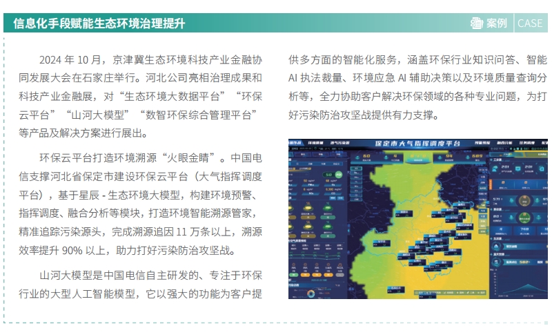 中國電信持續(xù)賦能生態(tài)環(huán)境治理,聚焦大氣環(huán)境監(jiān)管、水環(huán)境監(jiān)管等領(lǐng)域,基于大模型、大數(shù)據(jù)、5G、衛(wèi)星遙感等技術(shù),打造環(huán)保云平臺、水環(huán)境綜合監(jiān)管系統(tǒng),推動環(huán)保與政府監(jiān)管高效協(xié)同,為公眾提供綠色便捷的生活服務(wù)。