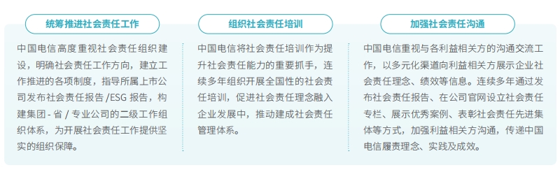 中國(guó)電信聚焦社會(huì)責(zé)任組織建設(shè)、社會(huì)責(zé)任能力提升、社會(huì)責(zé)任溝通等方面,持續(xù)提升社會(huì)責(zé)任工作管理能力。